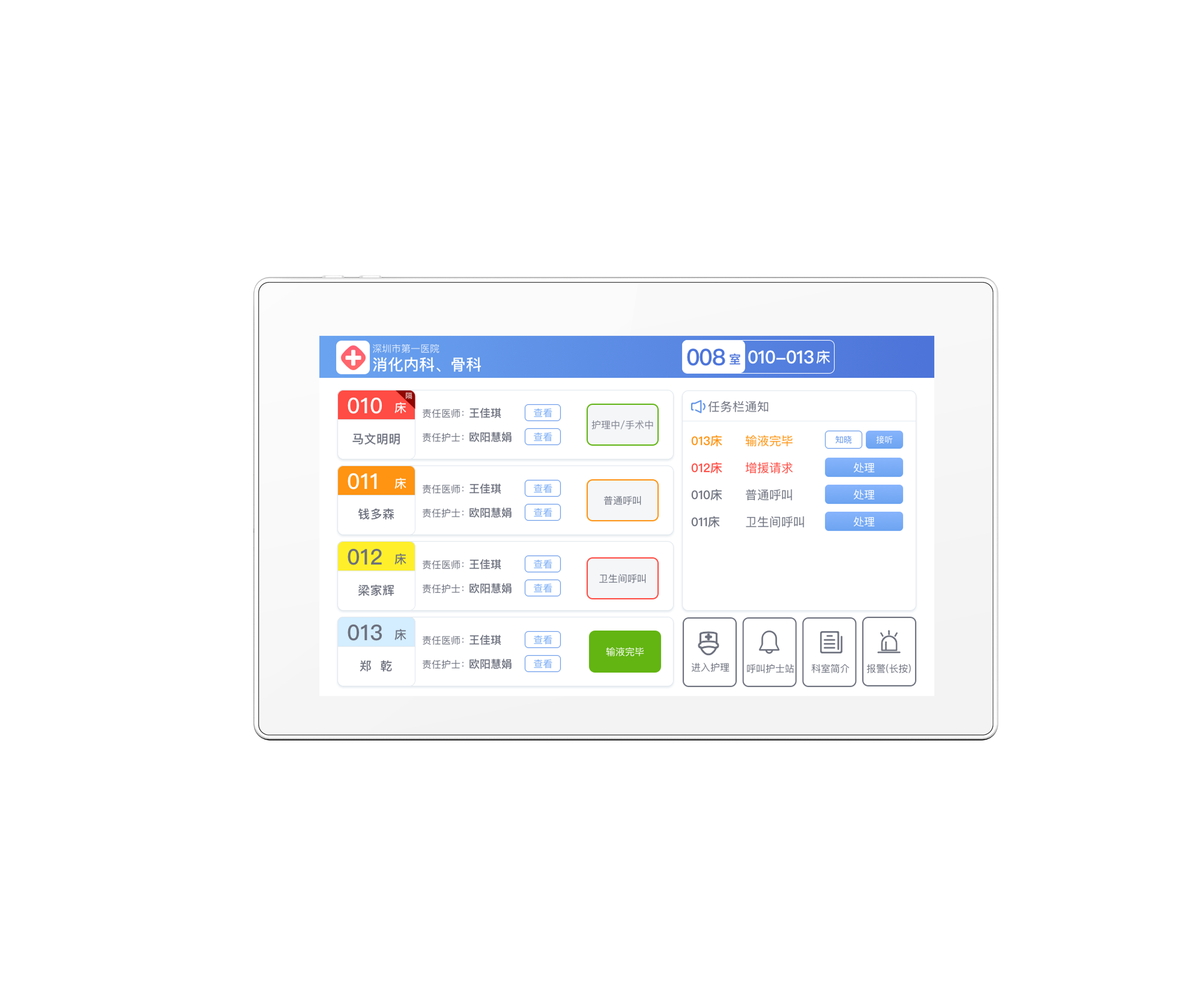1、采用10.1寸觸摸顯示屏, 720P高清攝像頭。配送持呼叫器,安裝在重癥病房的設(shè)備帶上,供重癥病房的病人對(duì)講時(shí)使用。