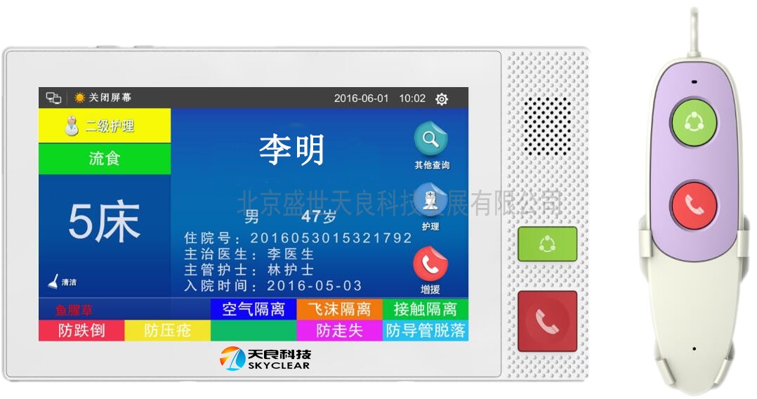 1)采用7寸TFT(觸摸屏),超薄面板,含手持呼叫手柄,安裝在病床上方的設(shè)備帶上,每個病床一臺,用于呼叫護(hù)士站,患者基本信息展示